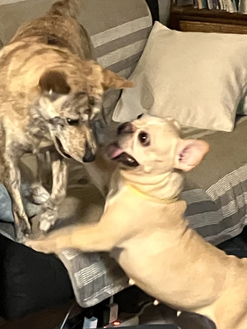 レスキュー後、我が家に来た時は、犬との付き合い方知らん?って感じで、多頭は無理かな…と思ったのですが、相性次第では多頭ありかも、と思えてきました。
