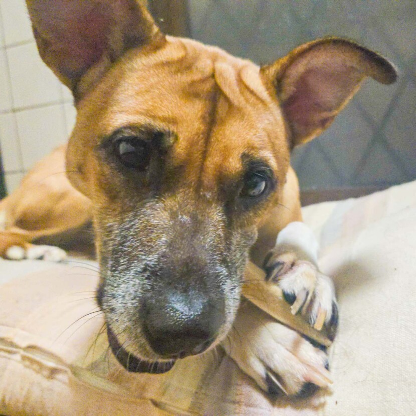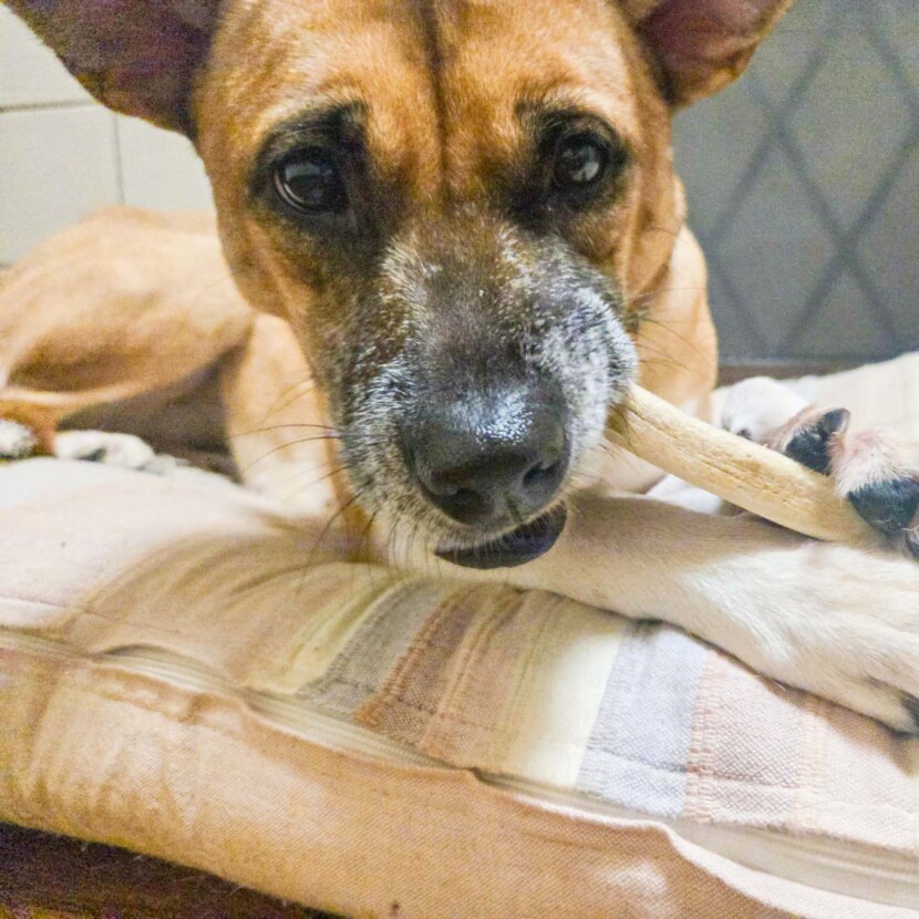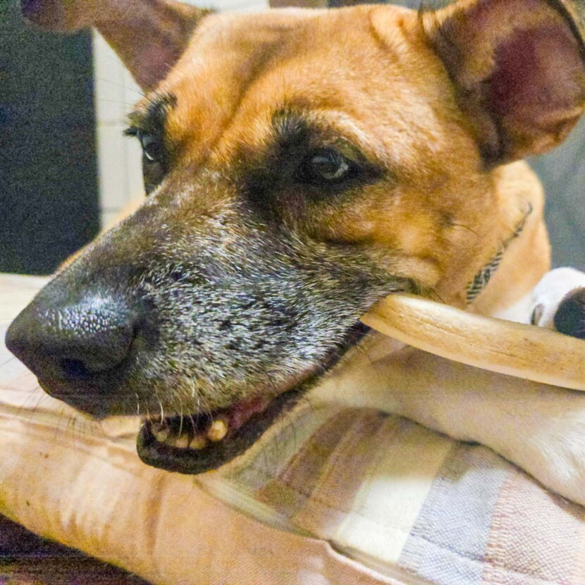 ふと見ると、ふわふわのお布団の上で鹿の角を夢中でガジガジ…。