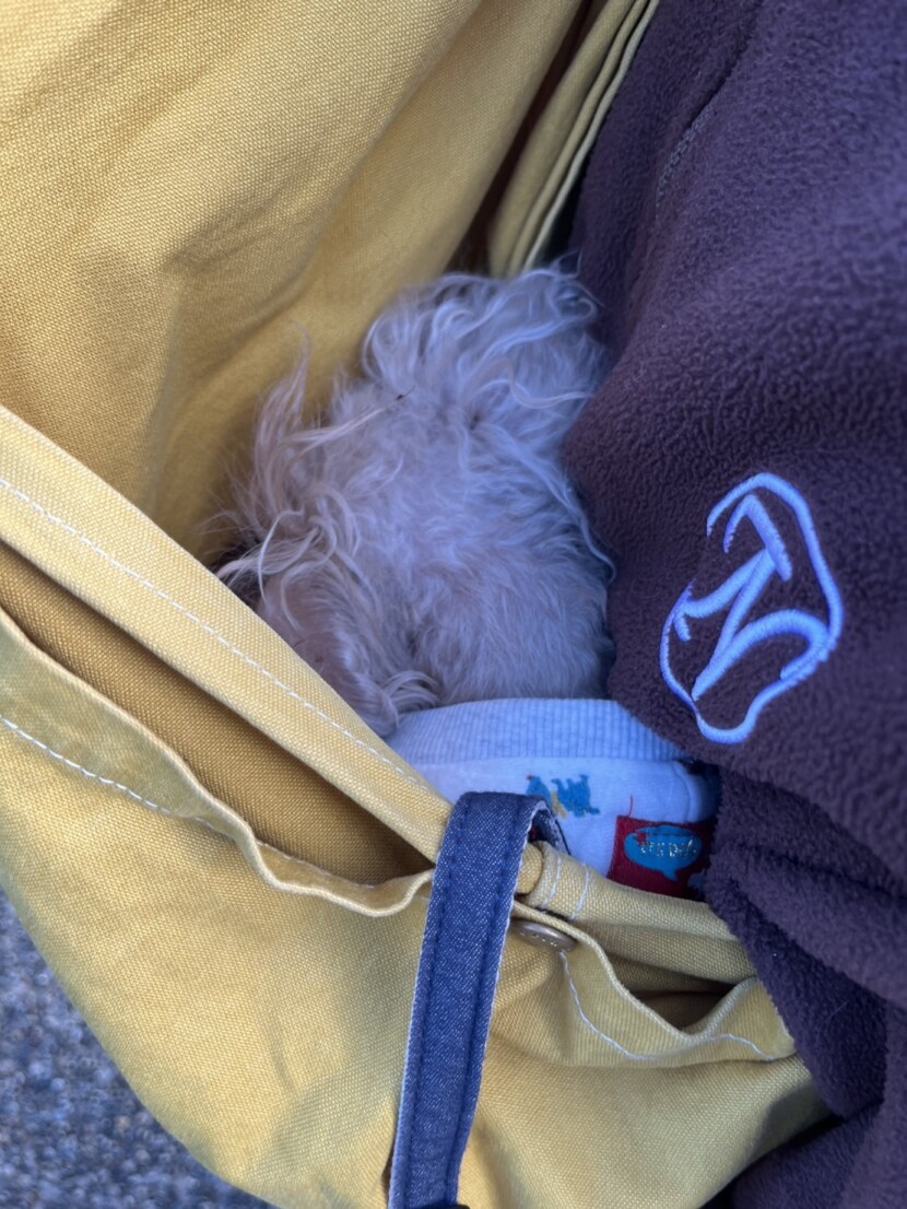 疲れたらカンガルーの子供のように抱っこ紐に包まってます。