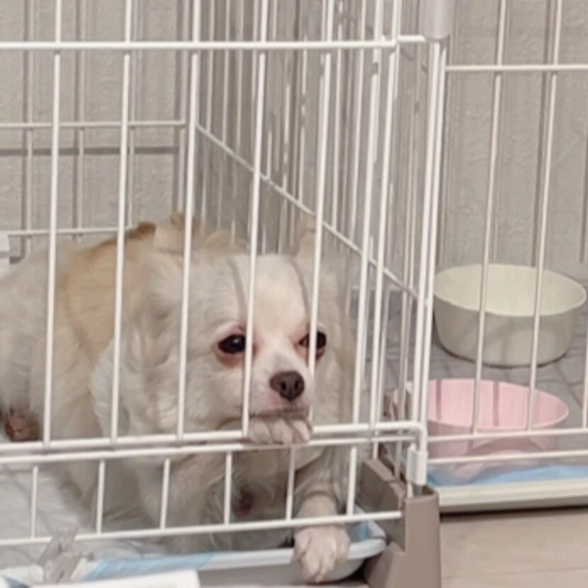 ケージでのお留守番も問題ありませんが、あざとかわいい寝方をしながら見つめてきます♡